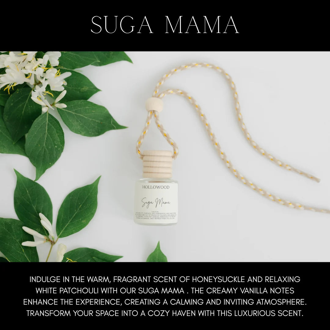 - SUGA MAMA Indulge in the warm, fragrant scent of honeysuckle and relaxing white patchouli with our SUGA MAMA. the creamy vanilla notes enhance the experience, creating and inviting atmosphere. Transform your space into a cozy haven with this luxurious scent