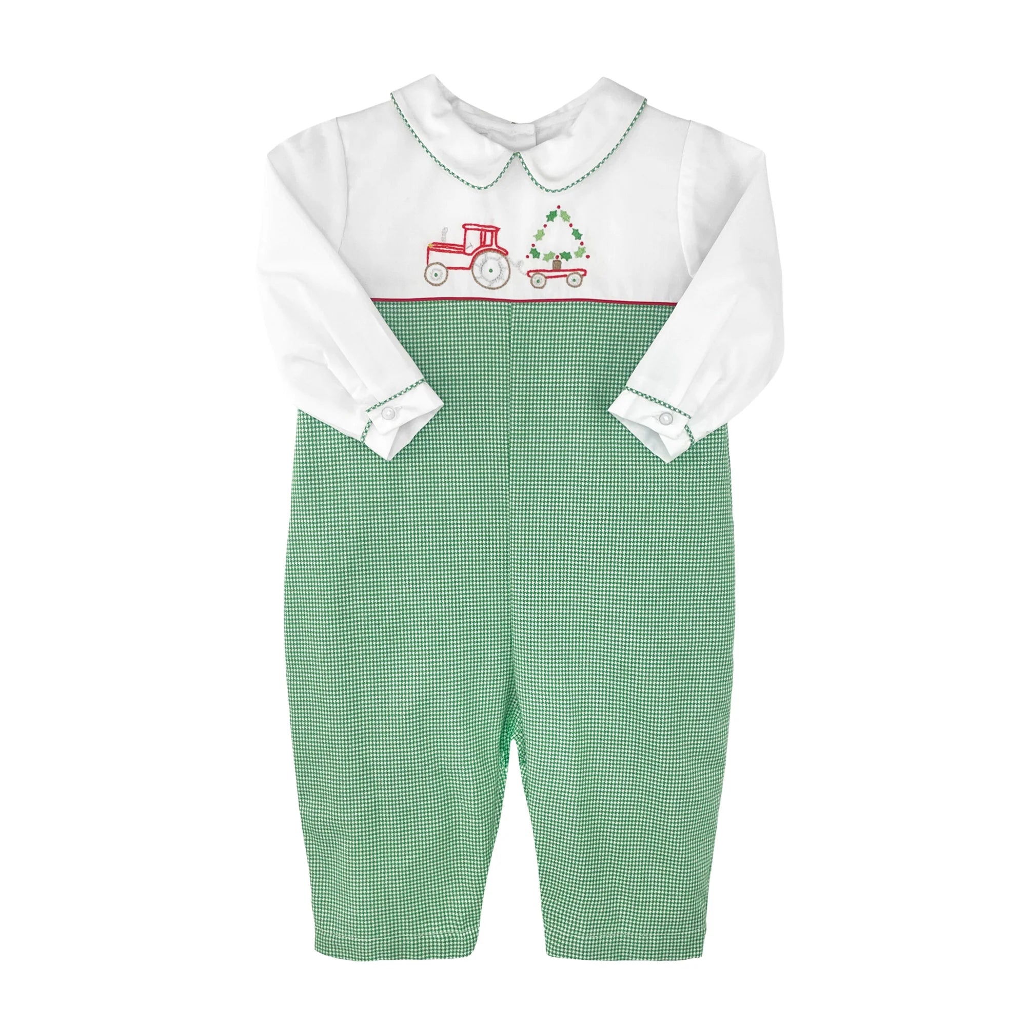 This longall comes with a long sleeve white top with a hand embroidered tractor and Christmas tree design on the front with a green check bottom and green trimmed edges.