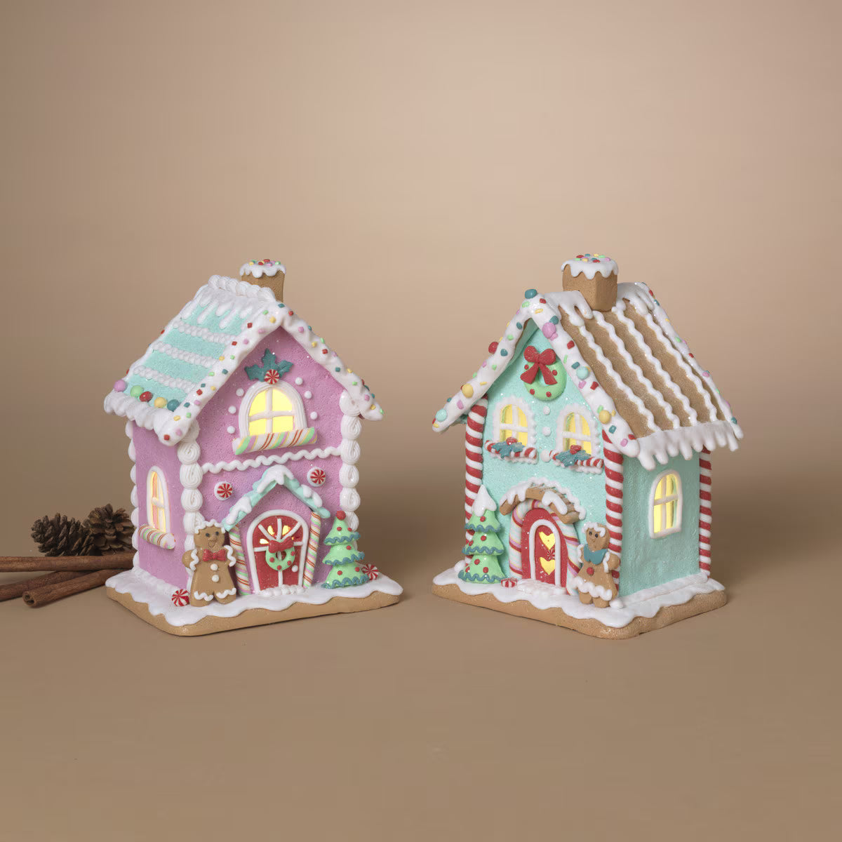 Bring a touch of whimsy to your space with this charming Lighted Clay Dough Candy House. Standing 9 inches tall and crafted from 90% clay dough, its delightful design is perfect for adding cozy ambiance. The house features built-in lighting powered by 3 AA batteries, not included illuminating your favorite nook with a warm glow. Measuring 9" tall by 6.5" long by 5" wide, this piece is compact enough to brighten shelves or tabletops. With two assorted playful styles, you can pick the one that sweetens your décor just right.