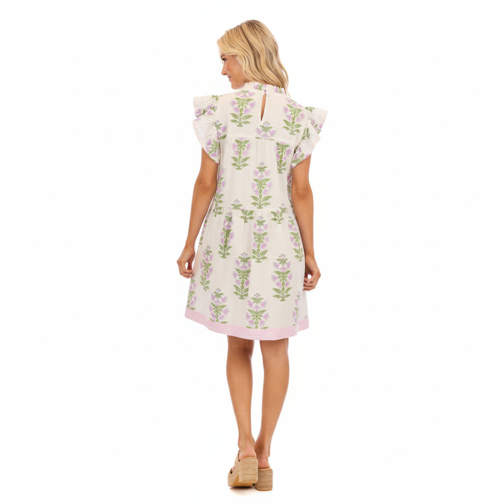 Poplin tiered dress features contrast bottom hem, flutter sleeves and ruffle neckline.