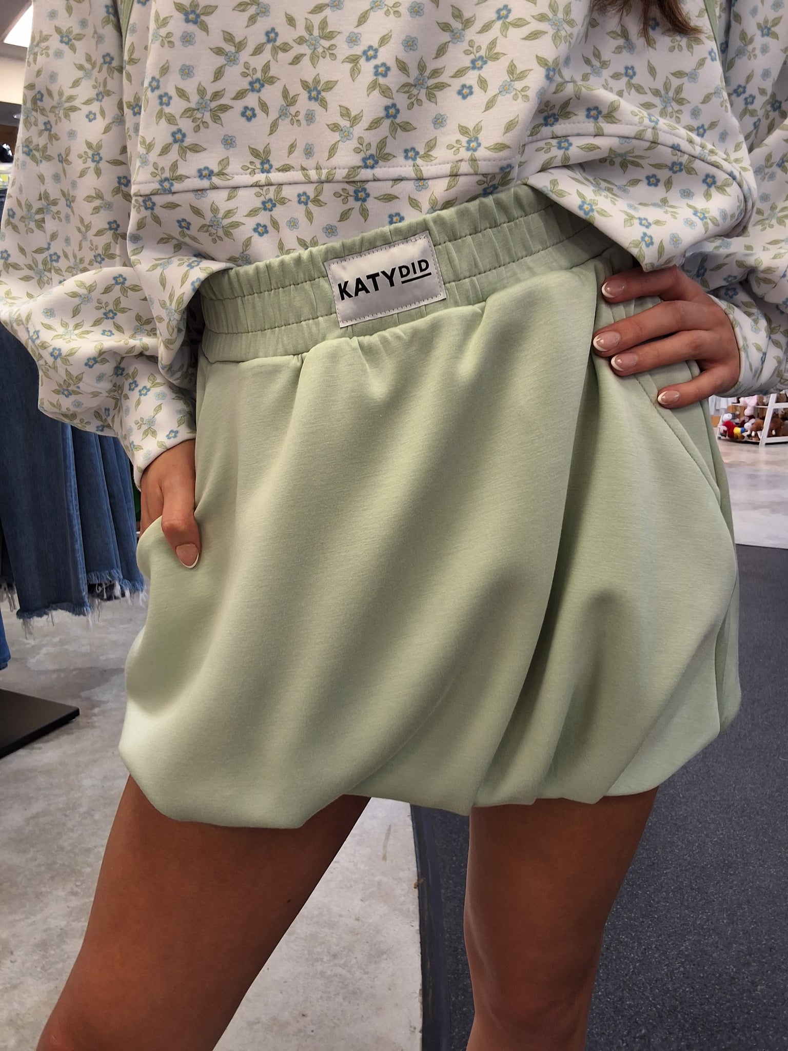 This Seafoam Scuba Skort is what happens when a Bubble Skirt meets main-character energy. The elastic waistband (complete with its little Katydid logo moment) sits comfortably and flatters instantly, while the built-in shorts keep everything covered no matter how chaotic your day gets. Add in the bubble hemline and pockets—aka the holy grail duo—and you’ve officially found your new favorite go-to for spring and summer..