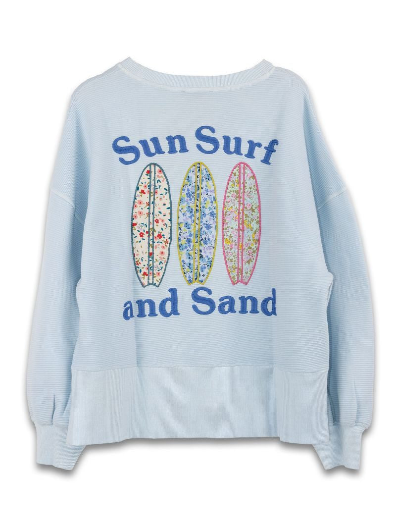 The Surf Crew sweatshirt combines comfort with distinctive style. Crafted from textured rib fabric, it features an oversized fit that works beautifully layered or worn solo. The crew neckline is finished with a ribbed collar, cuff, and hem for a polished look. A striking embroidered multi-media design adorns the back, while the Simply Southern logo is embroidered on the chest. Perfect for casual wear or weekend adventures.