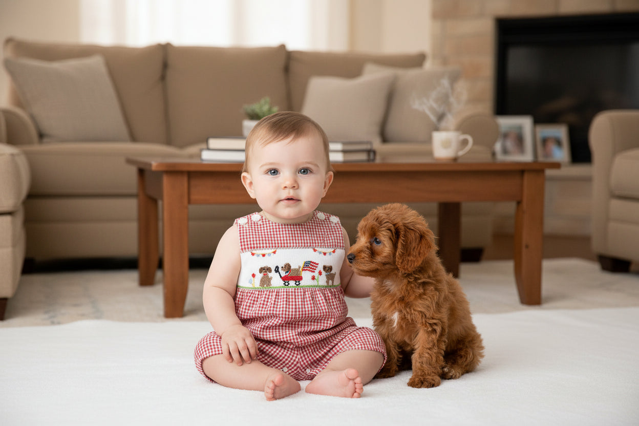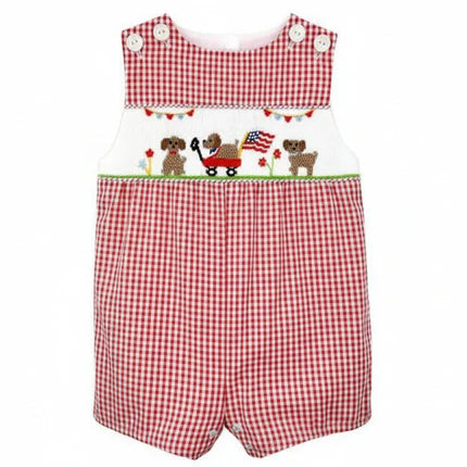 This button shoulder Jon-Jon features red and white windowpane check fabric and a picture smocked panel. The cute puppy design is perfect for summer fun.