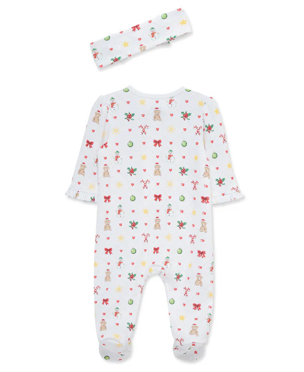 Dress your baby girl in this adorable footie featuring a festive Christmas print, making it the perfect outfit for celebrating the holiday season in style.