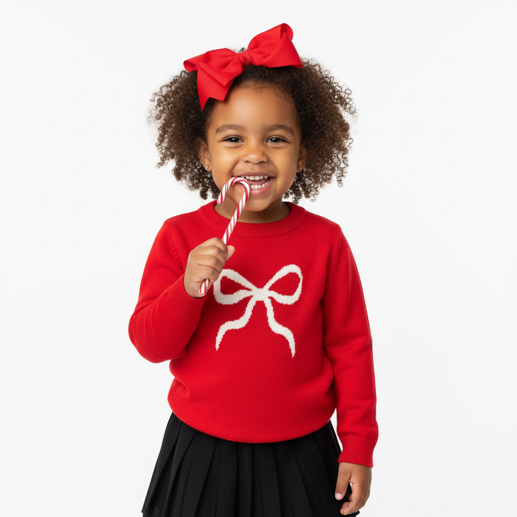 This red bow sweater is a cozy and festive choice for your little girl, designed to keep her warm and cheerful throughout the holiday season. Made from 100% cotton, it offers comfort and breathability, making it perfect for all-day wear. The playful bow detail adds a charming touch, making this sweater a delightful addition to any holiday outfit.