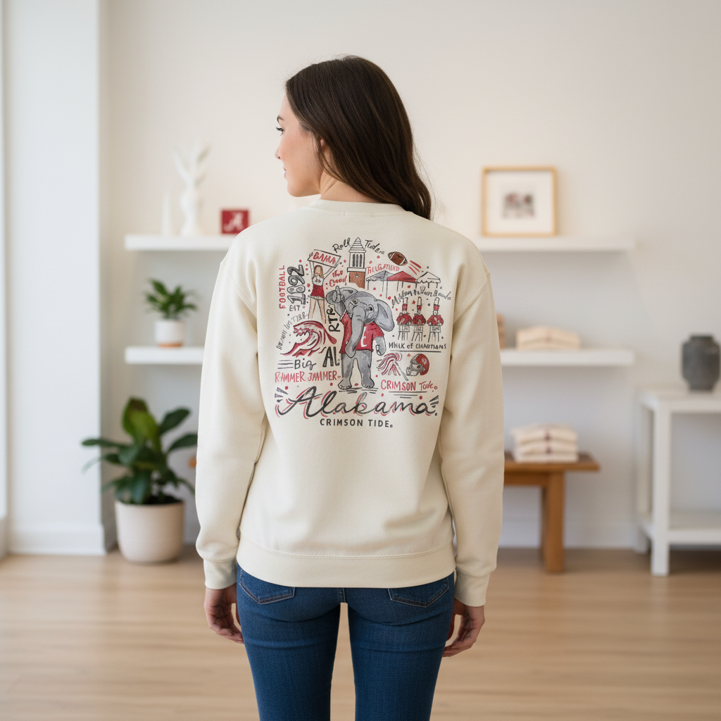 Celebrate every moment of Alabama gameday with the BIG AL COLLAGE Sweatshirt, a playful tribute to your favorite University landmarks. This comfy Comfort Color Ivory long sleeve sweatshirt features a bold, large back print showcasing a lively collage of all the iconic sights and spirited traditions that bring the Crimson Tide experience to life. Perfect for game day, tailgates, or casual days cheering from anywhere, this tee lets you wear your Alabama pride in style and comfort. Embrace the energy and show off what makes every game unforgettable!