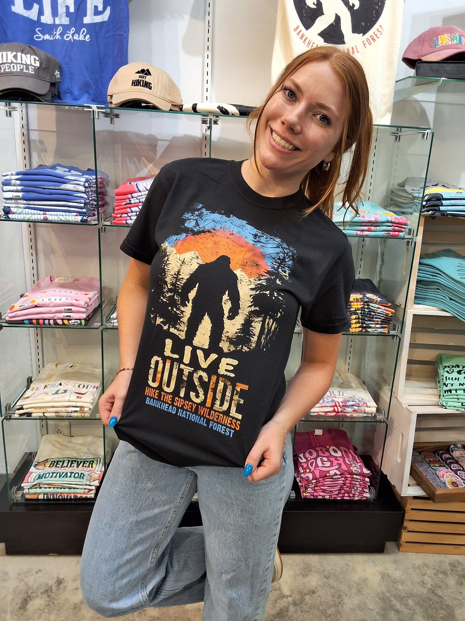 Live outside, live local! Made just for Deb & Co. this Sipsey Wilderness/Bankhead National Forrest tee is just what a hiker needs. Embrace your love for nature with our Leave Live Outside Bigfoot Tee. Made from 100% cotton, this tee features the iconic Bigfoot and the message "Live Outside".