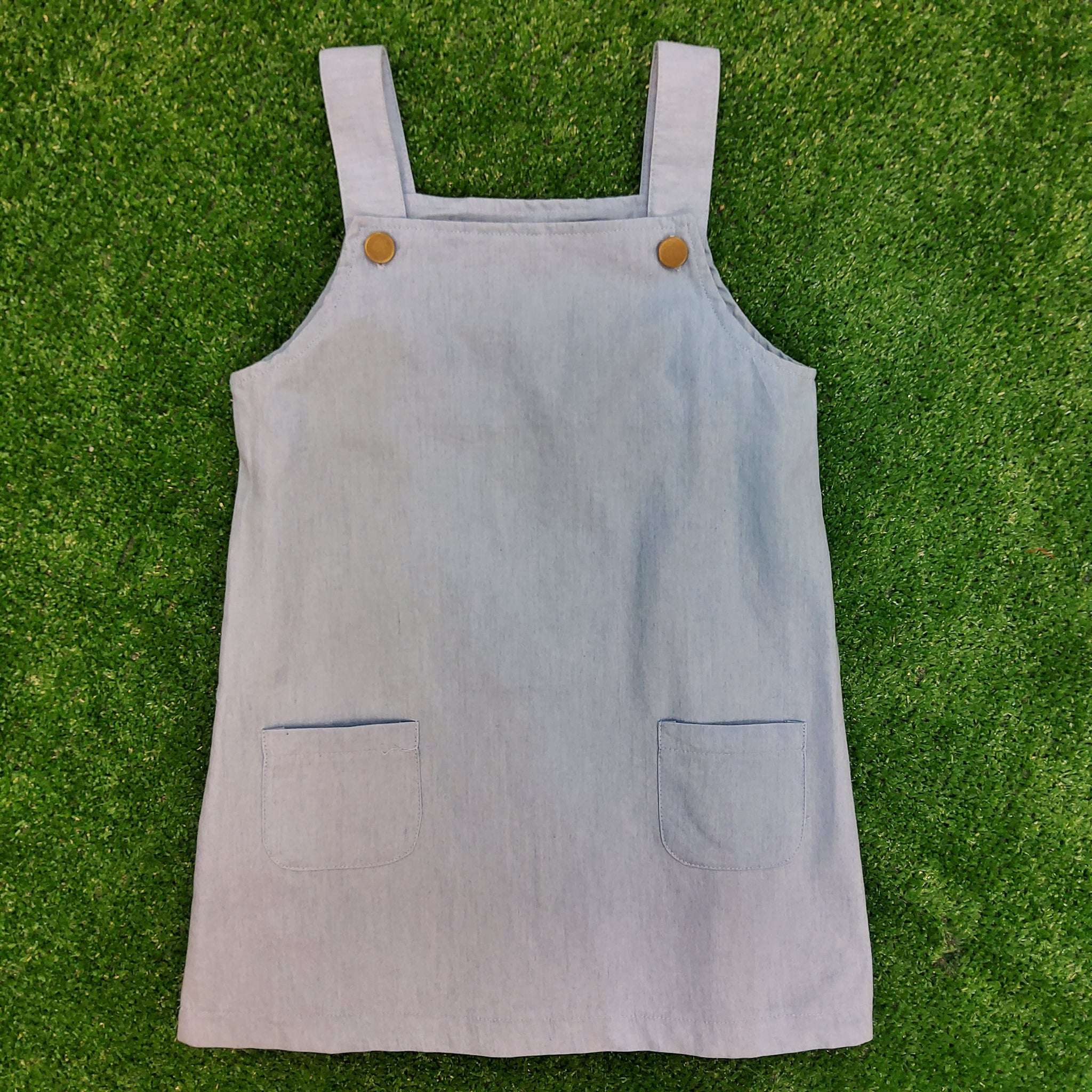 Classic style chambray jumper has front patch pockets and button shoulder straps. With A-Line styling, this cutie is perfect as a sundress or for layering.