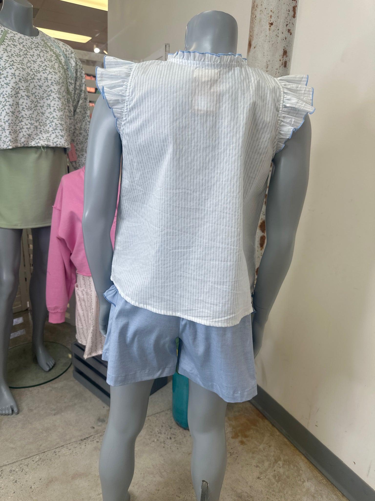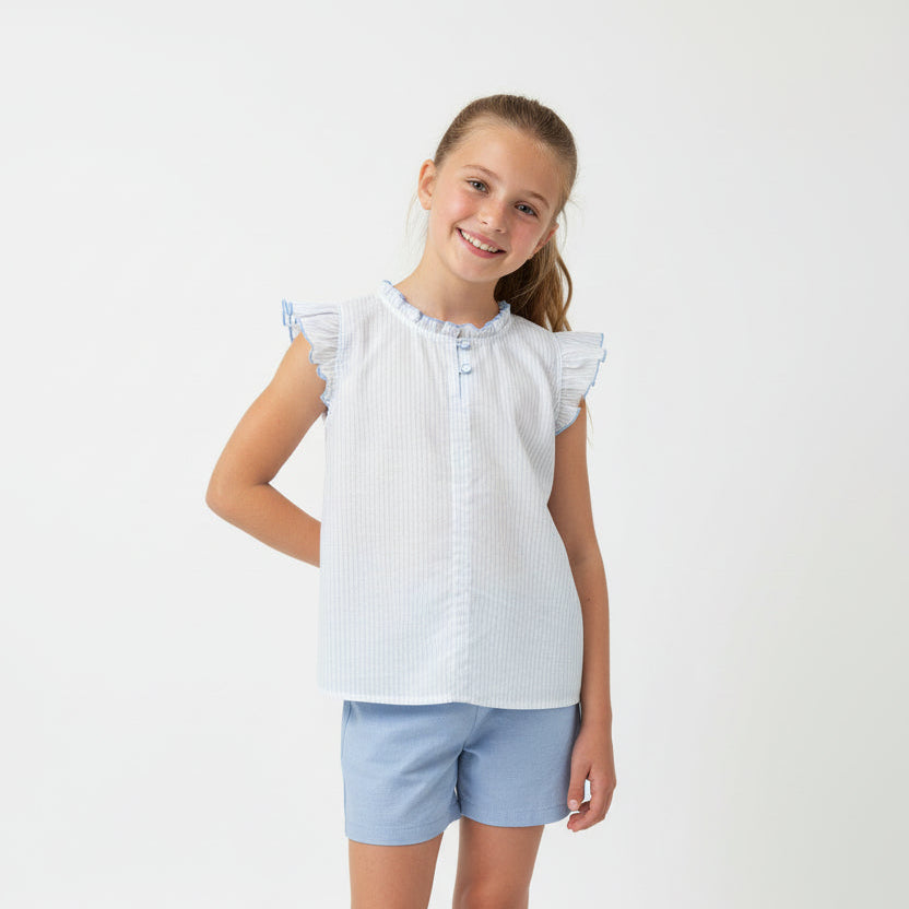Soft light blue stripes create a fresh, timeless look while flutter sleeves add movement and charm. The crewneck and pearlized button details bring understated elegance to an easy-wearing piece. Constructed from 100% cotton knit for all-day comfort, it's machine washable and ready for whatever comes next.