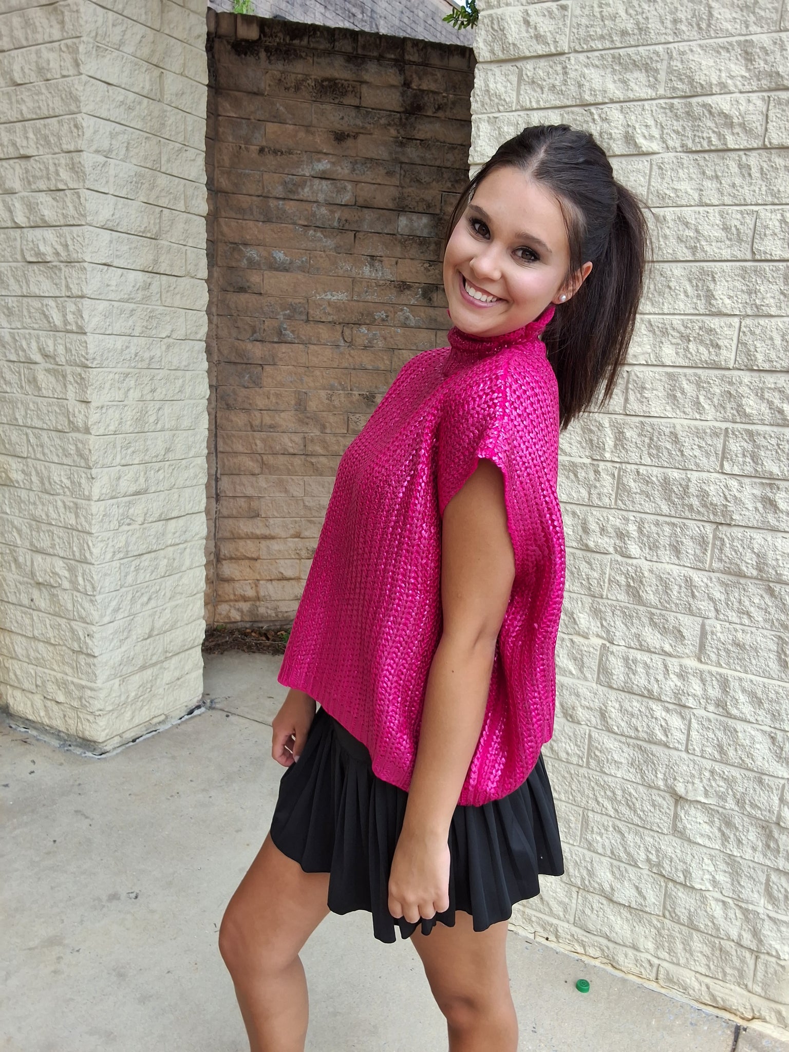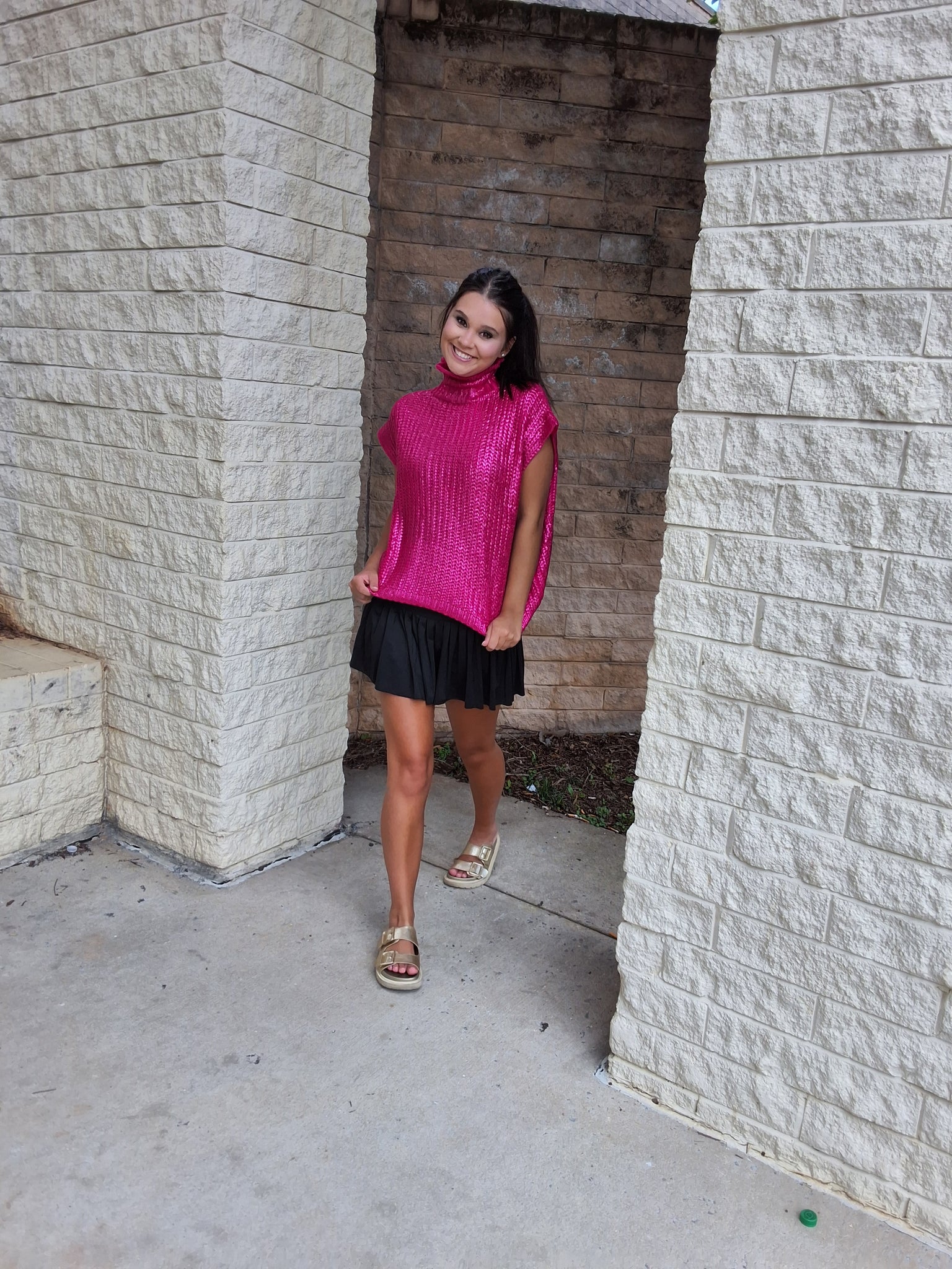 METALLIC FOIL SLEEVELESS TURTLENECK SWEATER TOPMODEL IS 5'8 AND WEARING SIZE SMALL