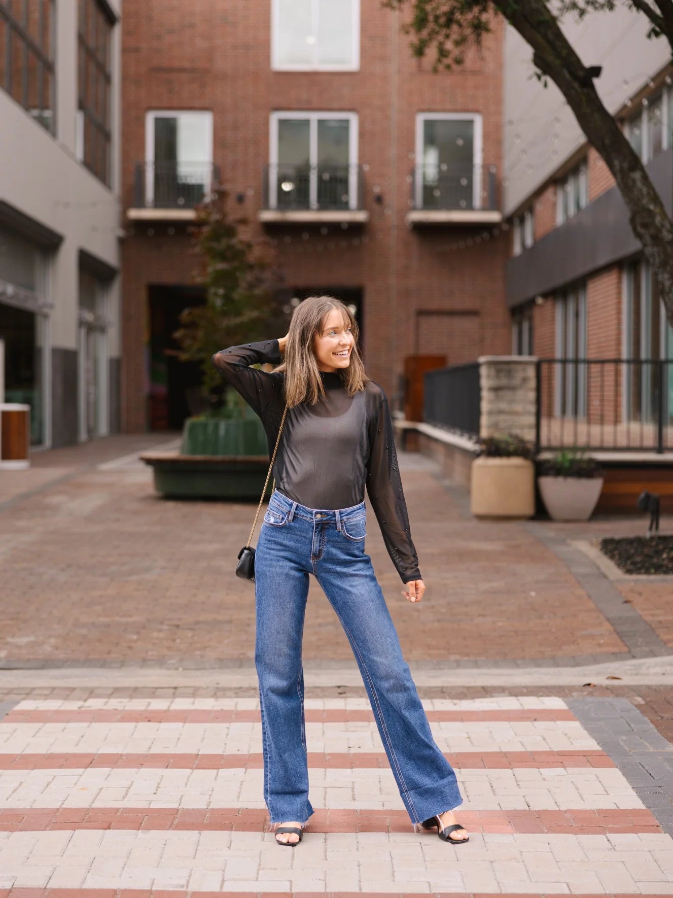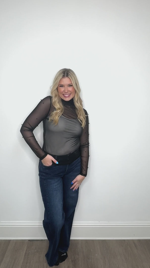 Elevate your style with this playful Black Mesh Top featuring delicate pearl details on the sleeves for a touch of glam. The unlined, high-stretch fabric offers a breathable fit that moves with you, while the mock neck adds a chic, sophisticated edge. Designed to run large, this top gives you the freedom to layer or wear it solo for a standout look. Perfect for adding a flirty yet elegant vibe to both casual and dressy outfits.