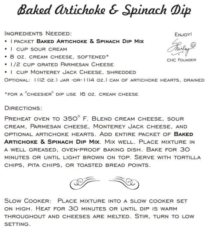 Artisan Kitchen Baked Artichoke & Spinach Dip Mix is a creamy, traditional-style baked artichoke and spinach dip perfect with bread, pita, or tortilla chips. It is a savory, creamy crowd-pleaser that will surely be a hit at any gathering.