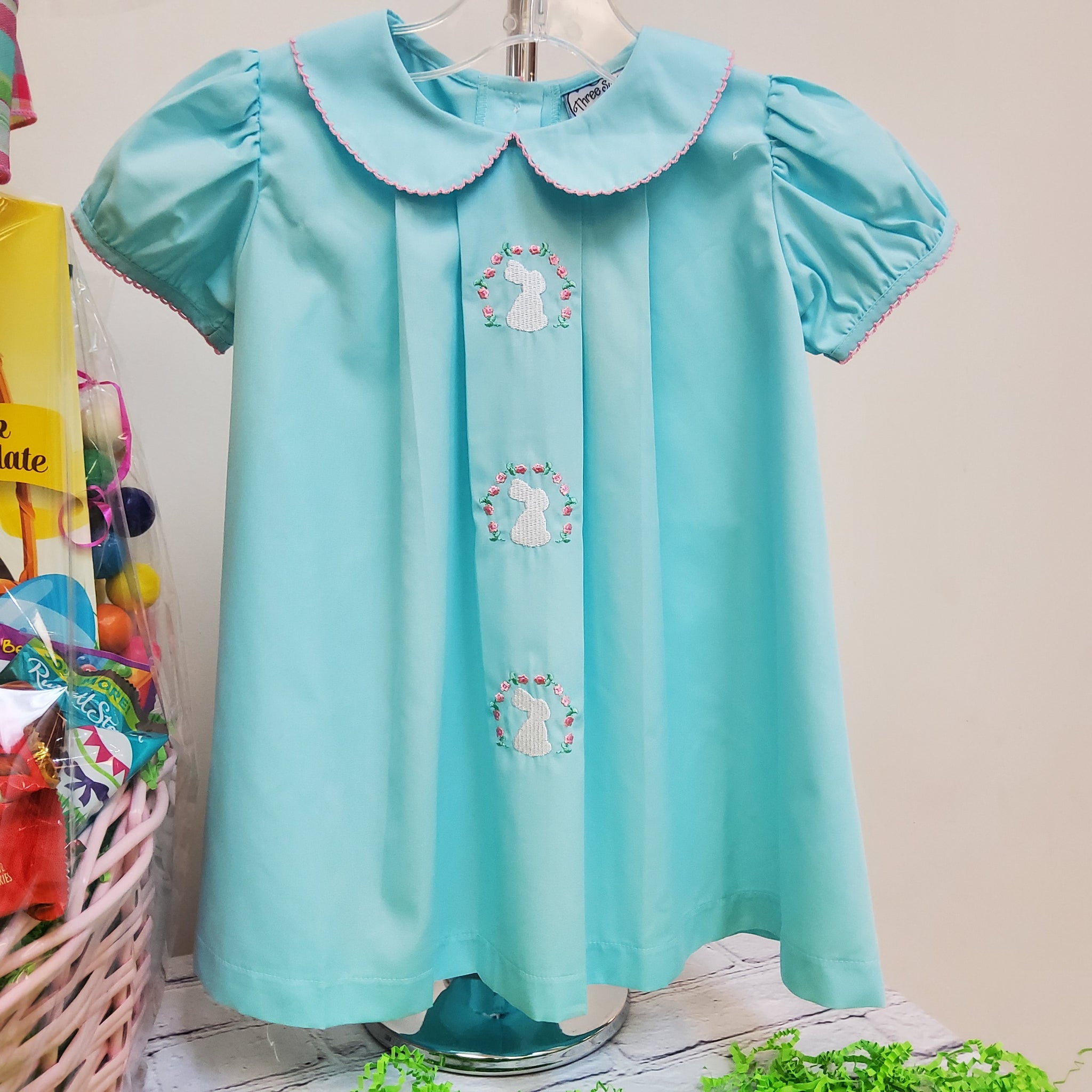Pleated front dress features bunny embroidery, Peter Pan collar, short puff sleeves and crochet trim. 23-705