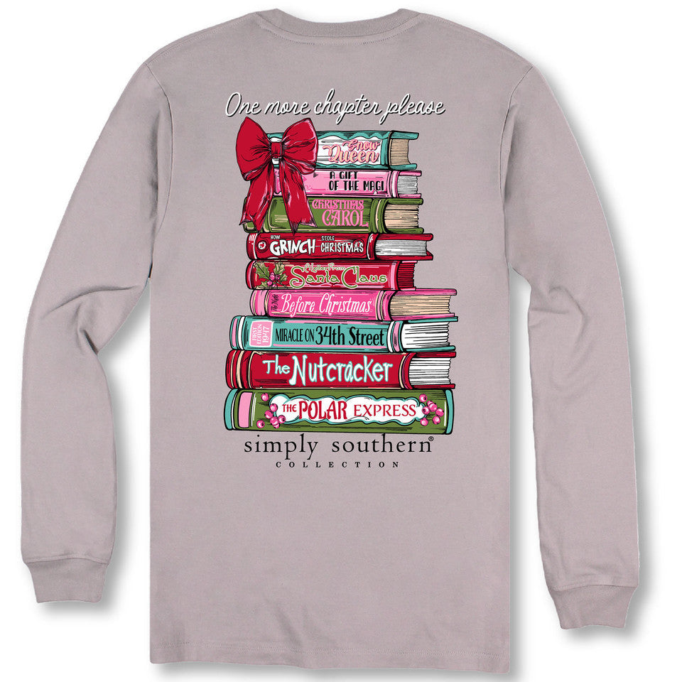 This driftwood grey long sleeve shirt features the charming phrase "One more chapter please" alongside a stack of Christmas-themed books, capturing the cozy spirit of the holiday season. Crafted from 100% cotton, it offers soft, breathable comfort ideal for extended wear. The Simply Southern logo is elegantly placed below the main design, with a matching smaller graphic on the left chest for subtle branding. Designed with unisex sizing, this shirt provides a versatile fit suitable for both men and women, making it a perfect gift or a festive addition to your wardrobe during colder months.