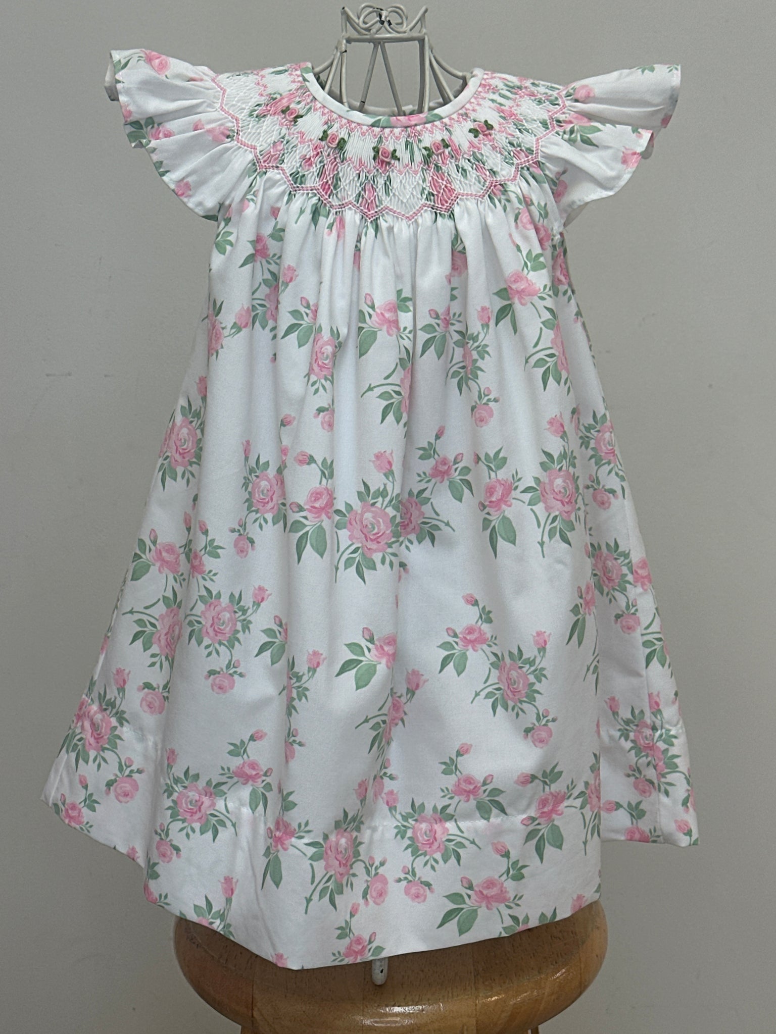 Our England Rose Floral Print Smocked Dress comes in sizes 12M-6Y. Also available, in smaller sizes please see our England Rose Floral Print Smocked Bubble.