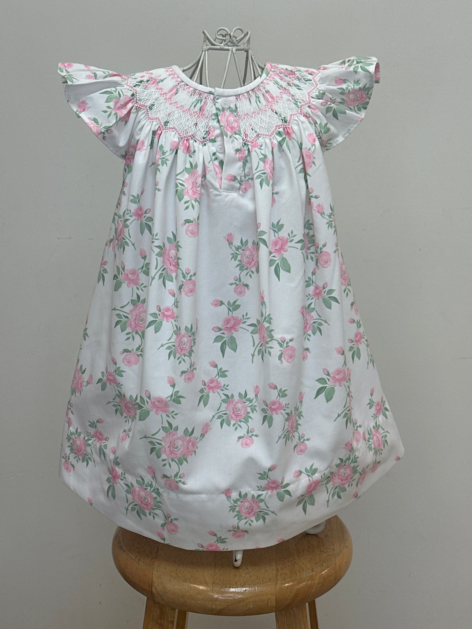 Our England Rose Floral Print Smocked Dress - perfect for any special occasion! This dress features a smocked top and angel wing sleeves. Your little one will be precious in this spring