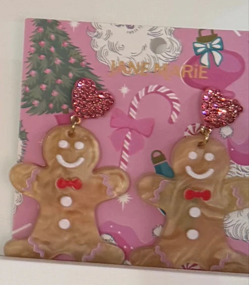 Cream, pink, red, white Acrylic gingerbread man with pink crystal heart post earrings