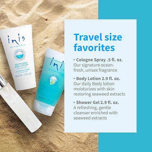 Inis Trio Gift Set. : Experience travel-size essentials with a spray cologne featuring a refreshing unisex scent, paired with a seaweed-enriched body lotion and shower gel to hydrate and invigorate your skin.